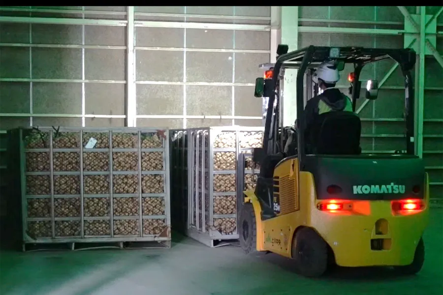新たな省力化体系では、鉄コンテナで収穫し、そのまま施設内の空っ風君®で風乾することで、バラ空け作業が不要となり、作業工程を大幅に削減できます。