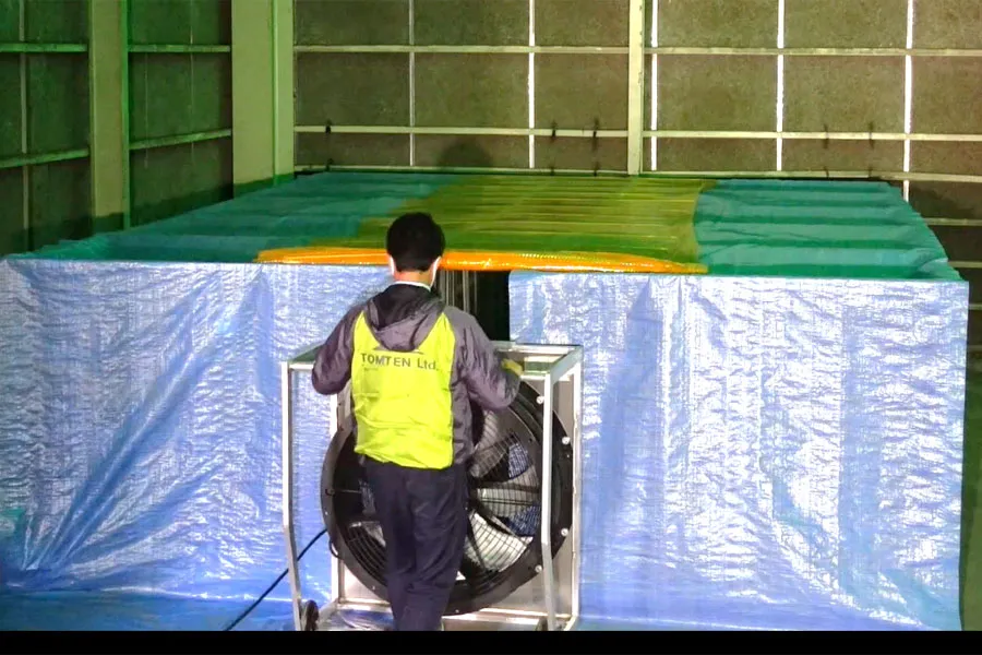 鉄コンテナで収穫し、ハウスや格納庫で鉄コンテナのまま空っ風君®で風乾が可能。